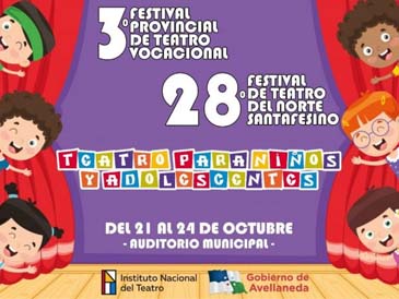 El Gobierno de Avellaneda junto al Taller de Teatro de la ciudad y el Instituto Nacional de Teatro invitan a la comunidad a disfrutar del 28º Festival de Teatro del norte santafesino y 3º provincial vocacional cuyas funciones para niños y adolescentes están previstas a partir de hoy lunes 21 de octubre en el Auditorio Municipal de Avellaneda, de acuerdo a la siguiente cartelera: