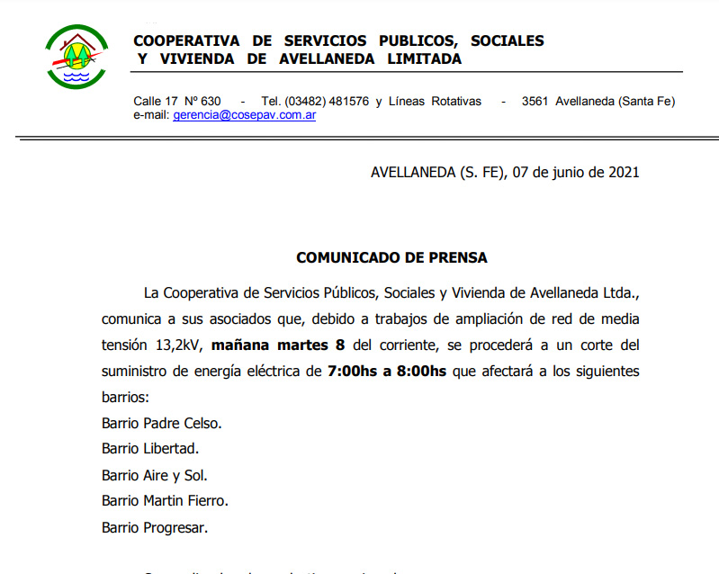 • COMUNICADO DE CORTE DE SUMINISTRO EN VARIOS BARRIOS DE AVELLANEDA