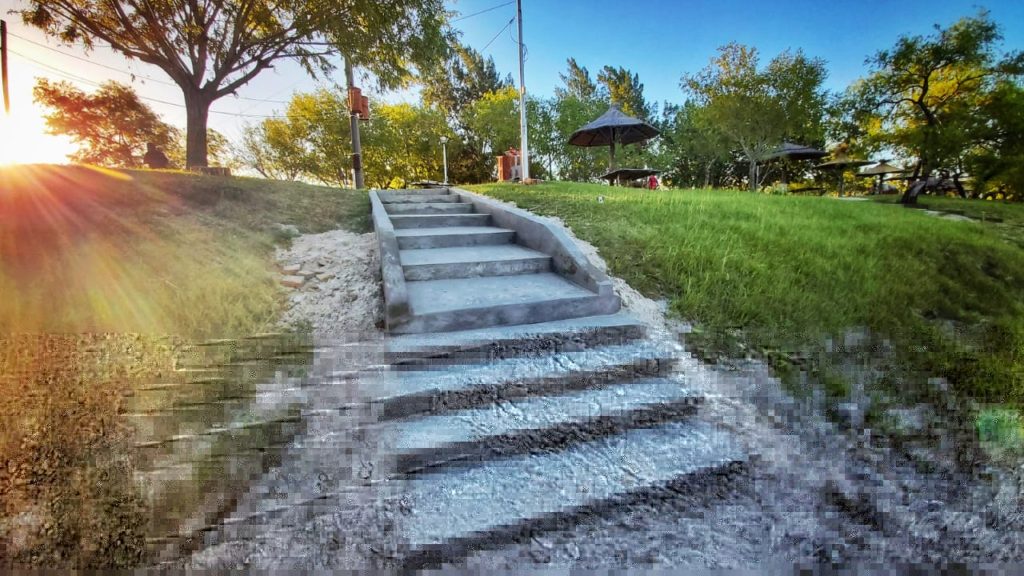 Estamos culminando la construcción de escaleras y rampas de acceso al sector de playa, para que todas las personas puedan desplazarse sin dificultades. También, en donde estaban los sanitarios de chapa hoy se están construyendo nuevos baños que serán más seguros e higiénicos.