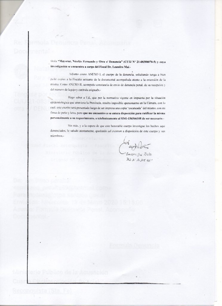 GRAVE DENUNCIA CONTRA EL DIPUTADO NICOLAS MAYORAZ POR PEDIDO DE «DEVOLUCIÓN» O RETORNO A UN ASESOR DE LA CÁMARA,se trata de una denuncia hecha por el DR Emiliano Peralta oriundo de la Cuidad de Reconquista que se desempeñaba como asesor del mismo , la cual dijo percibir 110 mil pesos de honorarios y de lo cual MAYORAZ le pidió un «RETORNO » de $60000, lo cual motivo que el Dr Emiliano Peralta decidió renunciar y hacer la denuncia correspondiente y mandar nota la Miguel Lifschitz presidente de Dicha camara.-
