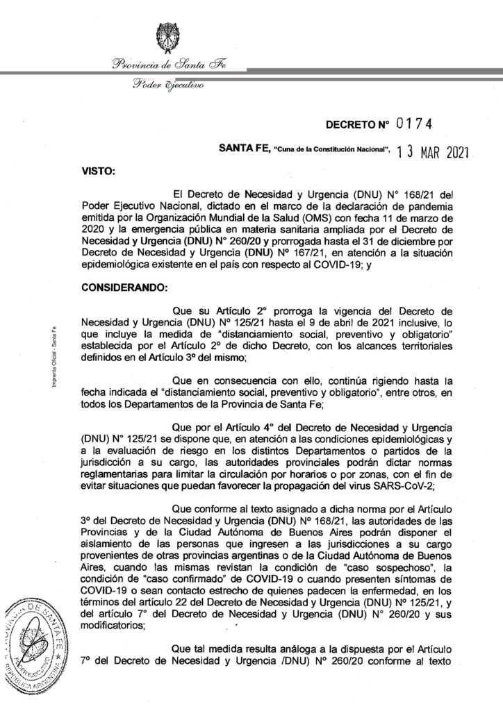 El gobierno de Santa Fe, a través del Decreto N.º 0174 firmado por el gobernador Omar Perotti, adhirió a la prórroga del Distanciamiento Social, Preventivo y Obligatorio hasta el día 9 de abril de 2021 dispuesta por el gobierno nacional a través del Decreto de Necesidad y Urgencia N.º 168/21.
