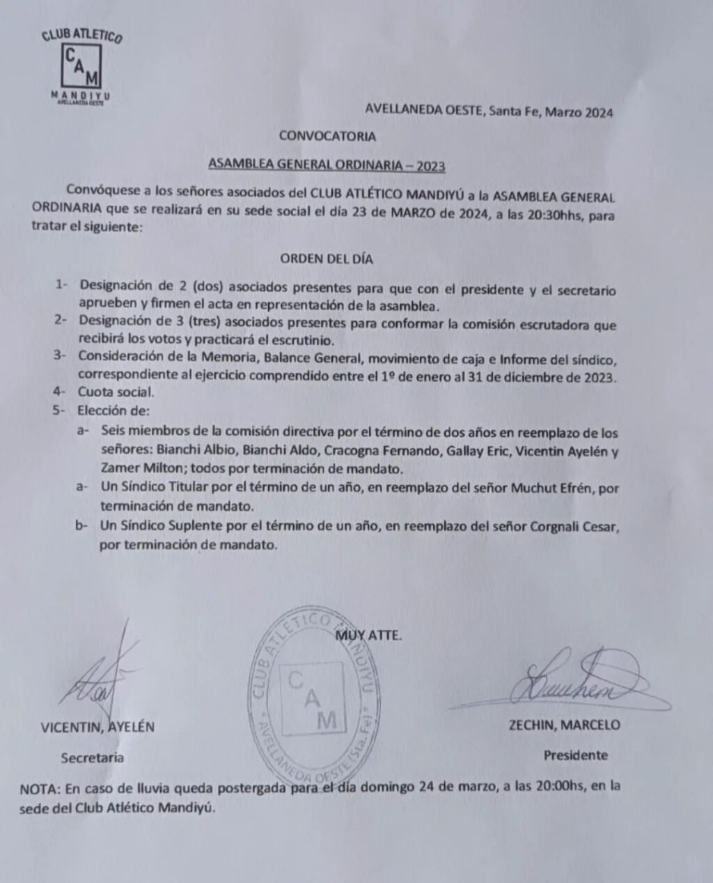DICHA INSTITUCION ESTA Llamando a sus asociados a una asamblea general ordinaria a realizarse el dia 23 de marzo del 2024 en sede del club atletico Mandiyu de la ciudad de avellaneda (SF) a las 20:30 hs, EL ORDEN DEL DIA ESTA DADO EN EL COMUNICADO OFICIAL DEL CLUB.