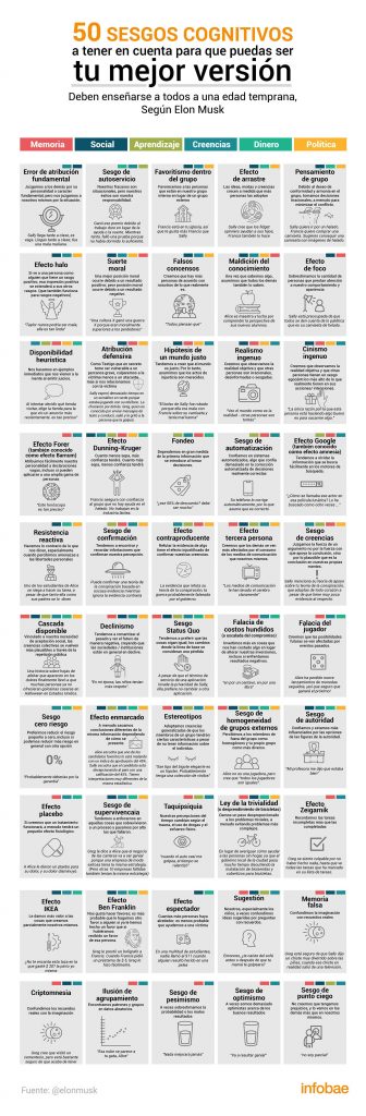 Conocer esta lista de sesgos, que van desde los relacionados con el aprendizaje, los sociales hasta los relacionados con el dinero y la política, puede ayudarnos a tomar decisiones más informadas y a darnos cuenta de cuándo estamos equivocados. “Deben enseñarse a todos a una edad temprana”, aseguró el emprendedor y magnate sudafricano en Twitter.