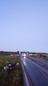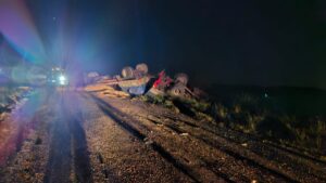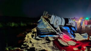 Fecha 17-04-2024 – Siendo las 01:10 horas, personal de la Comisaria II UR IX, tomo intervención en accidente de tránsito, donde por causas que se tratan de establecer entraron en colisión Camión Mercedes Benz, conducido por masculino de 58 años, dom. Localidad de Recreo, quien adujo que circulaba por ruta Nac. N°11, sentido sur a norte y se encontró con un camión volcado sobre la cinta asfáltica situación que provoco que pierda el control de su conducido y vuelque (quedando este sobre la banquina), seguidamente se entrevistaron con ciudadano de 61 años, domiciliado en la localidad de Alajandra, manifestó que momentos antes sin intervención de terceros perdió el control de su camión. Ambulancia de emergencias 107 procedió al traslado de ambos conductores.