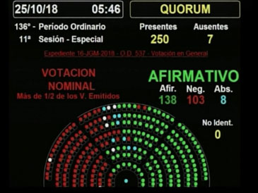 Por 138 votos a favor, 103 en contra y ocho abstenciones el oficialismo consiguió aprobar una iniciativa que tuvo mucha resistencia de parte de la oposición. La iniciativa pasa al Senado, donde se prevé que sea tratada en el recinto el 14 o el 21 de noviembre. Durante la madrugada los diputados del Peronismo Federal, vinculados a un sector de los gobernadores justicialistas, junto con los de Cambiemos ayudaron a volcar la mayoría por la afirmativa.