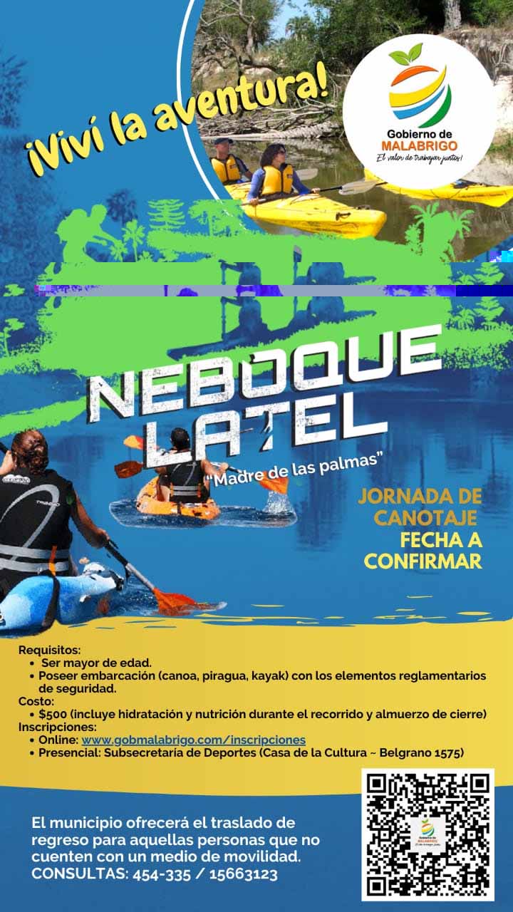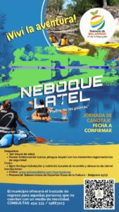 ¿Te gusta la aventura en contacto con la naturaleza? Tenemos una propuesta que seguramente te va a gustar: AVENTURA NEBOQUELATEL, una jornada de canotaje por nuestro “Arroyo Malabrigo” desde el puente de Berna hasta el Camping “Arenas Blancas”. Un recorrido para disfrutar y apreciar a pleno las bellezas naturales y los valores históricos de nuestra región.