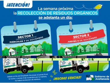 – Sector 2 (Recolección diurna): la recolección de orgánicos del día viernes 9 se realizará un día antes, el jueves 8 de noviembre en el horario habitual.