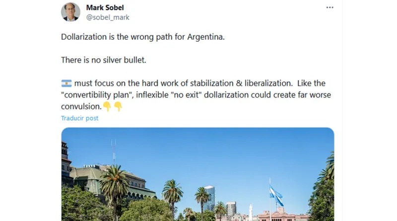 El exrepresente de Estados Unidos en el directorio del FMI durante el gobierno de Barack Obama, Mark Sobel, en un documento expresó que «la dolarización es una estrategia ‘sin salida’ potencialmente peligrosa y podría sembrar la semilla de una gran contracción y colapso».